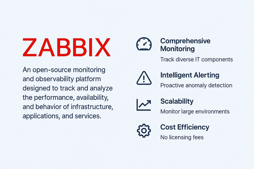 Zabbix is an open-source monitoring and observability platform designed to track and analyze the performance, availability, and behavior of infrastructure, applications, and services.